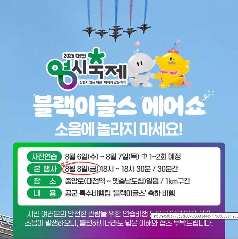 - 8월 8일: 블랙이글스 에어쇼(오후 6시), 축캉스 콘서트 개막 무대