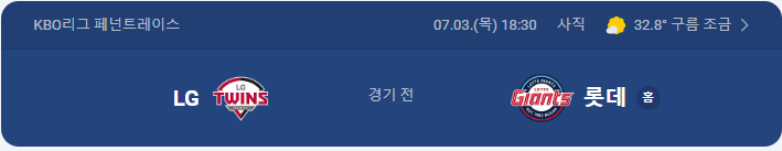 LG 트윈스와 롯데 자이언츠의 2025년 7월 3일 페넌트레이스 경기가 오늘 저녁 6시 30분, 부산 사직구장에서 열립니다. 현재 롯데가 홈 팀입니다.